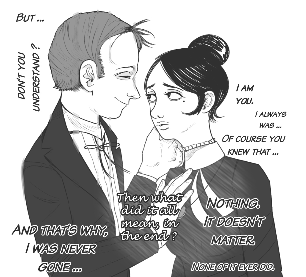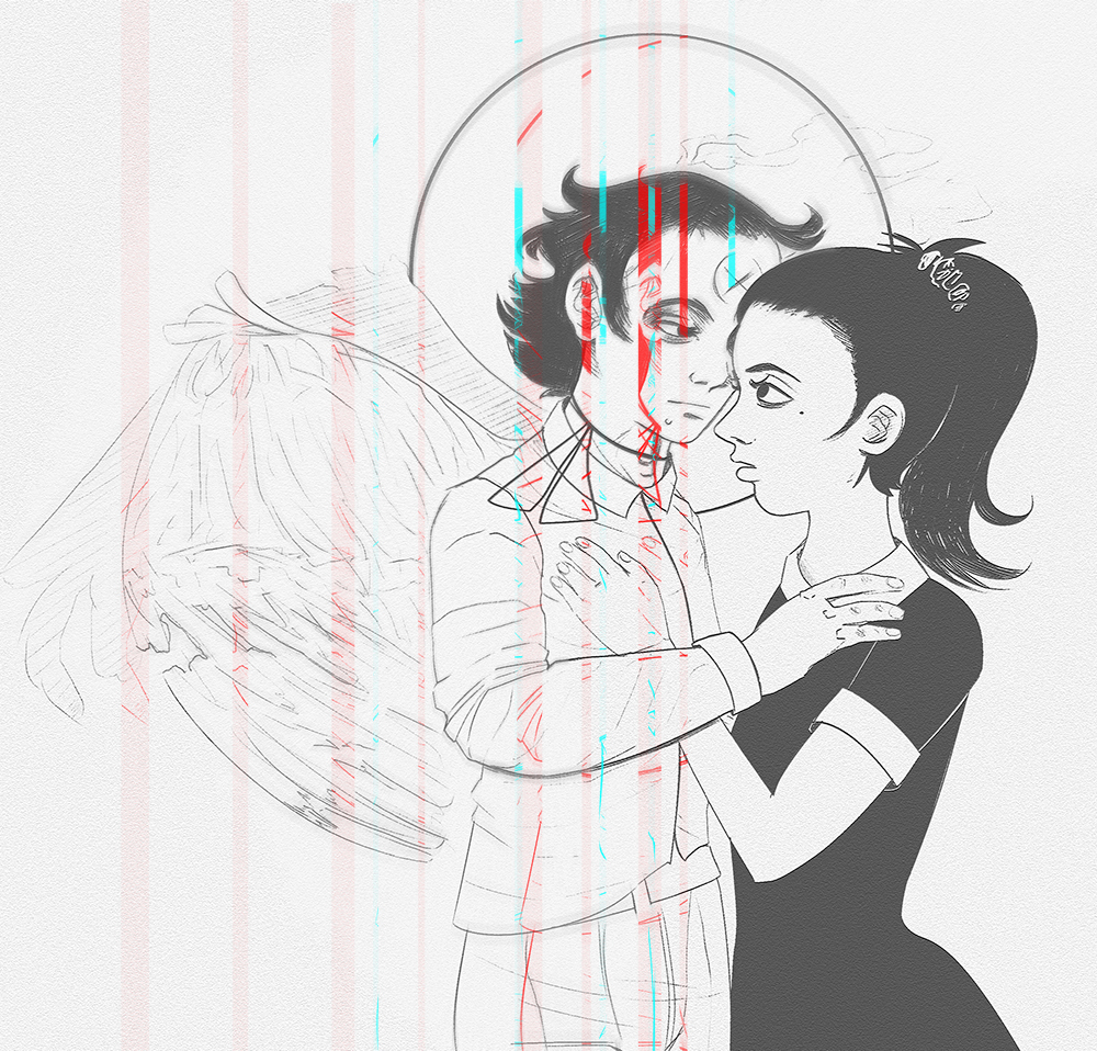 The obscuring of the left eye in the duo piece isn’t inferring anything occult – rather, it refers to ‘the hidden’ or ‘the unmasked self’. This is alluding to Arcade’s past. The left according to the Greek philosopher, Homer, is representative of ‘evil’ as opposed to the right which is ‘good’. Of course, Arcade is far from immoral or rather, ‘evil’ – this symbolism points to the obfuscation of his past association (through progenitors) with the paramilitary fascist organization, the Enclave. Arcade’s arc (hehe, Arkas) is all about his reconciliation of his past, to thereby liberate him of former haunts (His six of spades/swords canonical playing-card, symbolically represents one ‘leaving the past behind’ – more or less, enlightening Arcade to step out of the shadow of his late Father to which he “…never got over it [his Father’s absence]”).